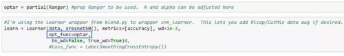 创建一个 partial,为 FastAI 调用 Ranger 做准备,然后把学习者的 opt_func 指向它