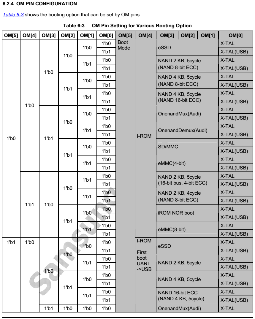 首先启动固化在IROM里的 BL0,它的作用:关闭看门狗、初始化icache、初始化PLL和设置系统时钟 等等这些上面已经有讲了。接下来通过OM[5:0] 来判断它的启动模式。