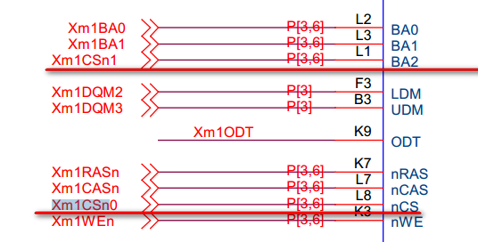 Xm1CSn0 和 Xm1CSn1 这两根片选信号线对应两个 DRAM 的地址,开发板的DDR2 SDRAM的片选信号接到了 Xm1CSn0引脚,所以它的访问地址为 0x2000_0000 开始的地址空间。