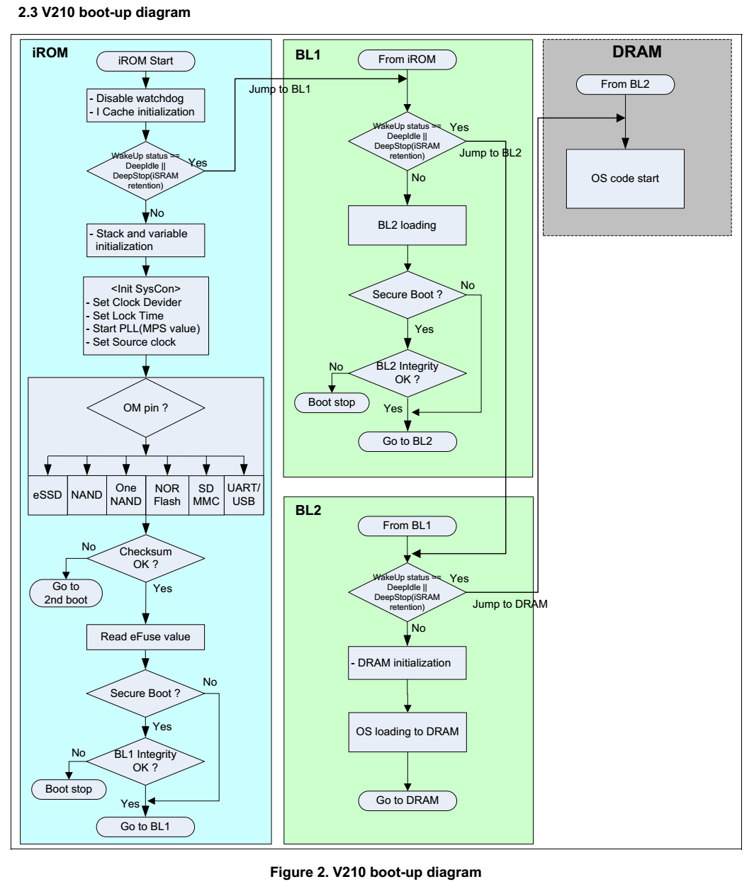 第二步:iROM启动代码加载BL1(bootloader)到iRAM,在安全启动模式下iROM对BL1进行整体校验。