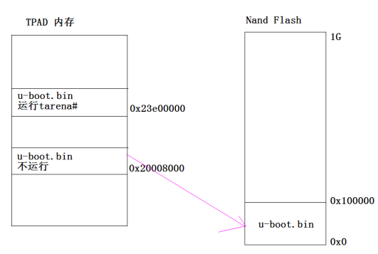 然后再将uboot拷贝到 0x20008000,从这个地址烧写uboot到nand中。
