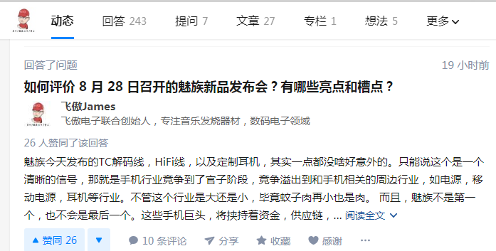 对于此次的魅族16s Pro发布会,前OPPO员工、现OPPO股东、现飞傲电子联合创始人@飞傲James在知乎上是这样评价的:“魅族发布TC解码线,HiFi线,以及定制耳机,其实一点都没啥好意外的。只能说这个是一个清晰的信号,那就是手机行业竞争到了官子阶段,竞争溢出到和手机相关的周边行业,如电源,移动电源,耳机等行业。不管这个行业是大还是小,毕竟蚊子肉再小也是肉。