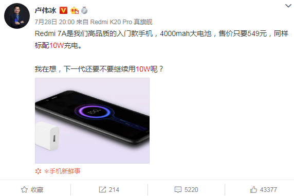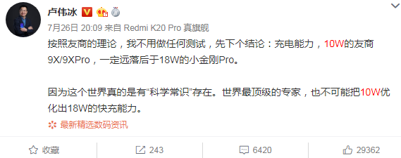 7月24日,小米集团副总裁、红米Redmi 品牌总经理卢伟冰开始吐槽荣耀9X系列的10W充电不给力,卢伟冰表示: