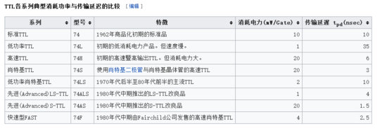 5:阈值电平(Vt):数字电路芯片都存在一个阈值电平,就是电路刚刚勉强能翻转动作时的电平。它是一个界于Vil、Vih之间的电压值,对于CMOS电路的阈值电平,基本上是二分之一的电源电压值,但要保证稳定的输出,则必须要求输入高电平> Vih,输入低电平 对于一般的逻辑电平,Vih,Vil,Voh,Vol以及Vt的关系可表示如下: Voh> Vih > Vt > Vil > Vol。 6:Ioh:逻辑门输出为高电平时的负载电流(为拉电流)。 7:Iol:逻辑门输出为低电平时的负载电流(为灌电流)。 8:Iih:逻辑门输入为高电平时的电流(为灌电流)。 9:Iil:逻辑门输入为低电平时的电流(为拉电流)。 门电路输出极在集成单元内不接负载电阻而直接引出作为输出端,这种形式的门称为开路门。开路的TTL、CMOS、ECL门分别称为集电极开路(OC)、漏极开路(OD)、发射极开路(OE),使用时应审查是否接上拉电阻(OC、OD门)或下拉电阻(OE门),以及电阻阻值是否合适。对于集电极开路(OC)门,其上拉电阻阻值RL应满足下面条件: (1): RL < (VCC-Voh)/(n*Ioh+m*Iih) (2):RL > (VCC-Vol)/(Iol+m*Iil) 其中n:线与的开路门数;m:被驱动的输入端数。 常用的逻辑电平:有 TTL、CMOS、LVTTL、ECL、PECL、GTL;RS232、RS422、LVDS等。 ·其中TTL和CMOS的逻辑电平按典型电压可分为四类:5V系列(5V TTL和5V CMOS)、3.3V系列,2.5V系列和1.8V系列。 5V TTL 和 5V CMOS逻辑电平是通用的逻辑电平。 3.3V及以下的逻辑电平被称为低电压逻辑电平,常用的为LVTTL电平。 低电压的逻辑电平还有2.5V和1.8V两种。 ECL/PECL和LVDS是差分输入输出。 RS-422/485和RS-232是串口的接口标准,RS-422/485是差分输入输出,RS-232是单端输入输出。 二、TTL 参看:TTL -- 维基百科 晶体管-晶体管逻辑(英语:Transistor-Transistor Logic,缩写为TTL),是市面上较为常见且应用广泛的一种逻辑门数字集成电路,由电阻器和晶体管而组成。TTL最早是由德州仪器所开发出来的,现虽有多家厂商制作,但编号命名还是以德州仪器所公布的资料为主。其中最常见的为74系列。 (1)TTL电压准位: 使用标准供电电压5V的TTL电压准位规范 输入电压准位 Hi输入电压:2.0V以上 Low输入电压:0.8V以下 输出电压准位 Hi输出电压:2.4V以上 Low输出电压:0.4V以下 由以上规范可以算出:前一级输出至次一级输入电压准位间,可以容忍的噪声边际电压是0.4V。 (2)74系列TTL IC的分类 1》以内部结构区分 标准型 结构跟构成的材料最简单,相对的特性也是不理想,所以此类型已经被淘汰多时。无英文简写,范例:7400。 早期的低功率型与高速型 低功率型,(英文 Low Power简写“L”),耗电低,但速度慢。范例:74L00。 高速型,(英文 High Speed简写“H”),速度较快,输出较强,但耗电高。范例:74H00。 由于 S 型耗电与 H 型相近,但速度极快。 LS 型的耗电与 L 型相近,但速度却快很多,甚至比 H 型还快。 因此 L 型与 H 型很快就退出市场。 肖特基(Schottky) 除了电阻器一样是做控流跟偏置用途,肖特基型最主要是采用肖特基二极管跟肖特基晶体管,改善切换速度。在市面上跟教育单位非常普及,特性也很不错,常常被用来搭配Intel 8051使用。LS型逐渐成为TTL中的主流。 肖特基型(英文 Schottky Logic,简写“S”),范例:74S00。 高级肖特基型(英文 Advanced Schottky Logic,简写“AS”),范例:74AS00。 低功率肖特基型(英文 Low Power Schottky Logic,简写“LS”),范例:74LS00。 高级低功率肖特基型(英文 Advanced Low Power Schottky Logic,简写“ALS”),范例:74ALS00。 快速(英文Fast,简写“F”) 快速型是有别于肖特基型所另外发展的高速TTL,范例:74F00。 CMOS(英语:Complementary Metal Oxide Semiconductor) 虽然此类型的编号与接脚规格跟TTL一样,但内部的实际结构是CMOS,而不是TTL所使用的接面晶体管。此系列具有CMOS的高输入阻抗特性与低耗电,但工作电压范围有别于先前RCA所发展的40跟45系列的CMOS逻辑IC。除早期的C系列外,此类CMOS的运作速度非常快。 CMOS,英文简写“C”,范例:74C00。 高级CMOS(英文 Advanced CMOS Logic,简写“AC”),范例:74AC00。 高速CMOS(英文 High Speed CMOS Logic,简写“HC”),范例:74HC00。 高级高速CMOS(英文 Advanced High Speed CMOS Logic,简写“AHC”),范例:74AHC00。 2》以输出型态分类 图腾式输出(Totem-pole Output) 大部分74系列的组合逻辑IC,都是采用图腾式输出。此种输出可以输出高电位与低电位。被称为图腾式则是因为电路形式像图腾一样配置。 开集电极式输出(Open Collector,简称O.C.) 此种输出不能输出高电位,输出只有开路与低电位两种状态。 可以承受较高的电压或与不同工作电压的电路连接。 有时开集电极式输出可用来应付比较重的负载(例继电器)。 可以允许多个开集电极式逻辑输出进行并联,作为Wired-AND使用。图腾式的逻辑门输出不能并联连接。 三态式输出(Tri-state或3-state) 在数字电路除了0跟1以外,另一种状态则是高阻抗,高阻抗对电路来说即是断路。主要是用于总线(bus)等。 史密特触发型输入(Schmitt Trigger) 此类型逻辑门具有所谓的迟滞电压,不易因为输入在0/1交界电压附近的小幅变化而产生输出跳动,主要用途是抗噪声、消除机械式接点的弹跳(暂态)现象,也可用来做RC振荡器等。 (3)代表性IC 与非门(NAND):7400、7410、7412、7420、7430 或非门(NOR):7402、7427 非门(NOT):7404、7414 与门(AND):7408、7411、7421 或门(OR):7432 异或门(XOR):7486 同或门(XNOR):74266 缓冲闸(Buffer):7407、74244 BCD(十进制)转七段数码管解码器:7447、7448 全加器(Full Adders):7483、74283 D型栓锁器(D-type Latches):74373 异步计数器(Asynchronous Counter):7