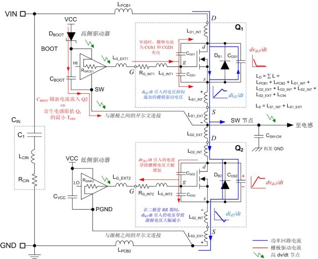 图 2:降压功率级和栅极驱动器的“剖析原理图”(包含感性和容性寄生元素)。