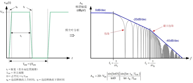 图 3:开关节点电压梯形波形及其频谱包络(受脉宽和上升/下降时间影响)。