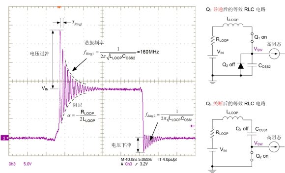 图 4:MOSFET 导通和关断开关转换期间的同步降压开关节点电压波形及等效 RLC 电路。