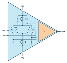 图2.运算放大器中的轨到轨双极晶体管输入级简化版。