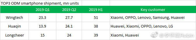 根据IHS Markit公布的2019年上半年ODM厂商智能手机出货量TOP3排名,其中闻泰科技(Wingtech)今年上半年智能机出货5100万部,排名第一,与华勤和龙旗的差距逐渐拉大。