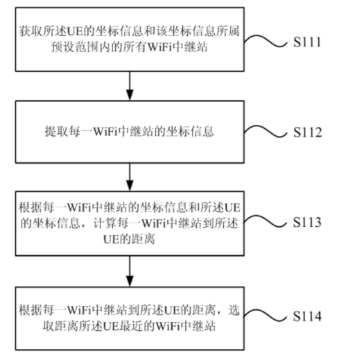 如上图为基于WiFi中继站的车辆调度方法的细分流程示意图。首先,获取UE的坐标信息和该坐标信息所属预设范围内的所有WiFi中继站,UE发送的打车请求还包括:出发地、目的地及UE的用户标识等信息。这里的预设范围的具体取值可根据UE所属城市的交通路况、所属城市的具体城区等信息进行设置和调整。