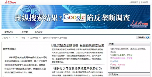 人民网上甚至还有针对 “ 谷歌陷反垄断调查 ” 的专题报道