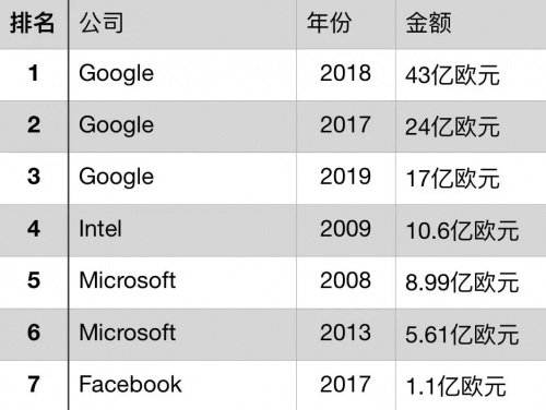 欧盟向各个科技互联网公司开出的罚单