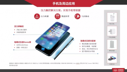 在手机及周边应用中,芯海科技有非常多的应用案例,例如:魅族力推的隐藏式压感Home键。还有当前最火的压力触控键替代音量键、电源键等机械按键的概念,侧边不需要开孔,提高整机颜值。最近曝光的vivo和华为旗舰机型可能会采用“瀑布屏”进一步提升手机颜值和未来感,手机侧边也变成了显示屏,达到无界的视觉效果,这么一来原本占据中框位置的音量及电源键就无处安放了,压力触控键就是这种场景的最佳拍档。除压力触控之外,在TWS耳机、手机适配器、无线充等产品中也有芯海科技MCU的很多量产案例。