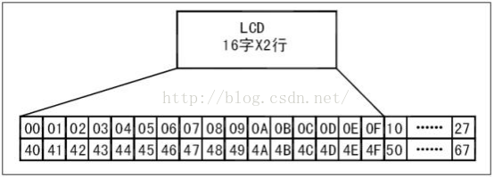 DDRAM就是显示数据RAM,用来寄存待显示的字符代码。共80个字节,其地址和屏幕的对应关系如下表: