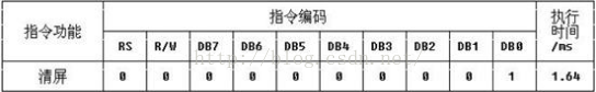 功能:<1> 清除液晶显示器,即将DDRAM的内容全部填入“空白”的字符码20H;