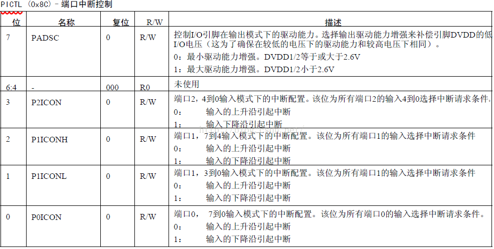 PICTL.0 —— 设置P0.1 口输入下降沿引起中断触发。