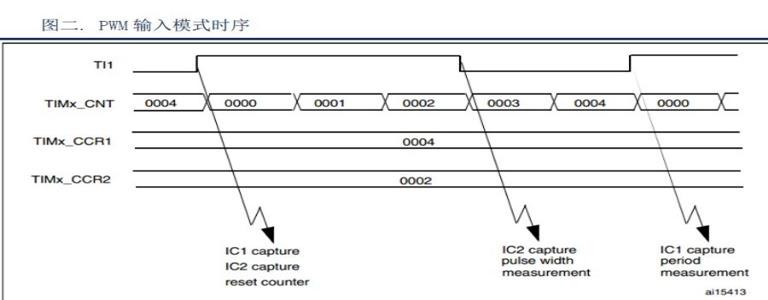 PWM输入是输入捕获的一个特殊应用,输入捕获就是当连接到定时器的引脚上产生电平变化时对应的捕获装置会立即将当前计数值复制到另一个寄存器中。你可以开启捕获中断然后在中断处理函数中读出保存的计数值。