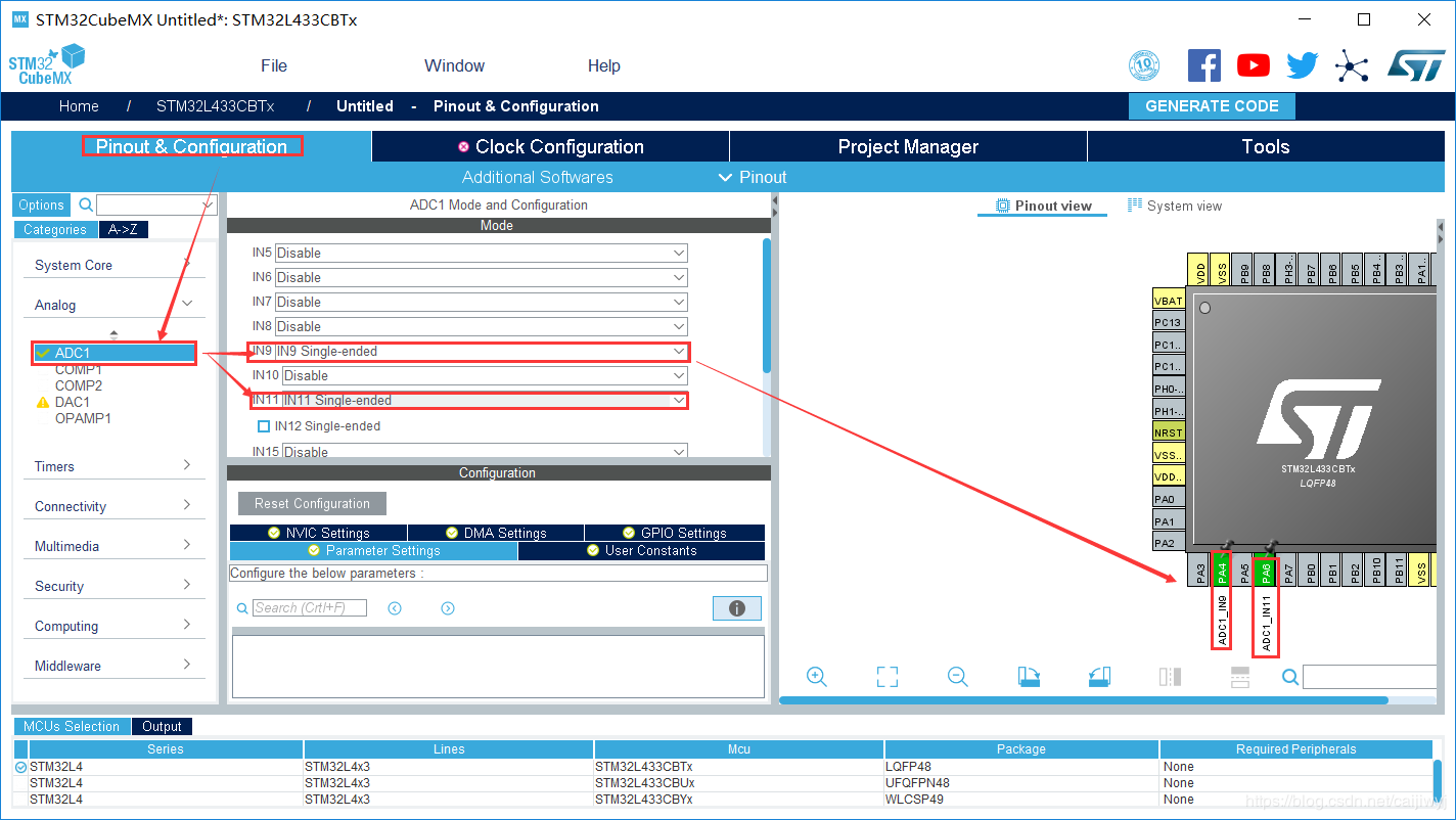 2.打开ADC1的通道9和通道11,发现PA4和PA6变成绿色,GPIO模式也自动变成ADC转换模式