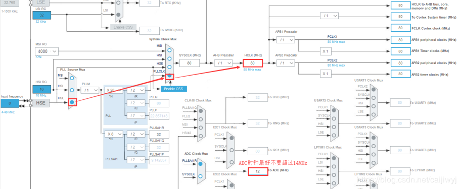 4.然后是配置时钟点击Clock Configuration,由于先打开了ADC而没有配置时钟,点到时钟配置时会显示