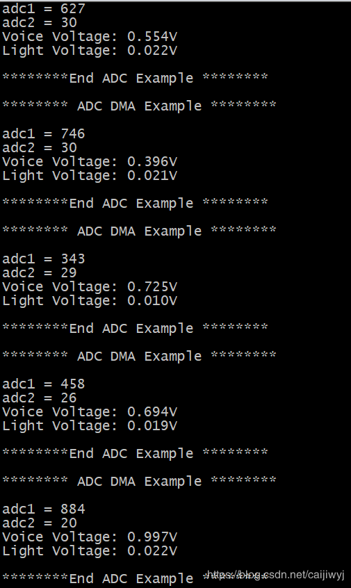 #include #ifdef __GNUC__ #define PUTCHAR_PROTOTYPE int __io_putchar(int ch) #else #define PUTCHAR_PROTOTYPE int fputc(int ch, FILE *f) #endif PUTCHAR_PROTOTYPE { HAL_UART_Transmit(&huart1 , (uint8_t *)&ch, 1, 0xFFFF); return ch; } int fgetc(FILE *f) { uint8_t ch; HAL_UART_Receive(&huart1,(uint8_t *)&ch,1,0xfff); return ch; } 在adc.c中void MX_ADC1_Init(void)是ADC的初始化,与STM32CubeMX中配置的一样,也可以在此处修改 第一种ADC多通道采样方法: 1.在main.c定义一个数组作为转换数据缓存数组 /* USER CODE BEGIN 1 */ uint32_t ADC_Value[100]; uint8_t i ; uint32_t ad1,ad2 ; /* USER CODE END 1 */ 2.在while(1)前函数去开启ADC转换和DMA传输 /* USER CODE BEGIN 2 */ HAL_ADC_Start_DMA(&hadc1,(uint32_t*)&ADC_Value,100); /* USER CODE END 2 */ 3.DMA采用了连续传输的模式,ADC采集到的数据会不断传到到存储器中(此处即为数组ADC_Value)。数组里面的数据会不断被刷新。由于ADC顺序先是通道9(声音传感器)再是通道11(环境光传感器),所以存到ADC_Value[0]的是声音传感器ADC采集到的数据,ADC_Value[1]是环境光传感器ADC采集的数据,依此类推数组偶数存的是通道9(声音传感器)ADC采样值,数组级数存的是通道11(环境光传感器)ADC采样值。 /* USER CODE BEGIN WHILE */ while (1) { HAL_Delay(500); for(i = 0,ad1 = 0, ad2 = 0; i<100;) { ad1 += ADC_Value[i++] ; ad2 += ADC_Value[i++] ; } ad1 /=50 ; ad2 /=50 ; printf("rn******** ADC DMA Example ********rnrn"); printf("adc1 = %drn",ad1); printf("adc2 = %drn",ad2); printf("Voice Voltage: %.3fVrn",ad1*3.3f/4096); printf("Light Voltage: %.3fVrn",ad2*3.3f/4096); printf("rn********End ADC Example ********rn"); HAL_Delay(1000); /* USER CODE END WHILE */ /* USER CODE BEGIN 3 */ } /* USER CODE END 3 */ 将数组偶数下标数据加起来求平均值得到通道9(声音传感器)ADC采样值,将数组偶数下标数据加起来求平均值得到通道11(光传感器)ADC采样值,减小误差,再将数据转换为电压值。 ADC采样值到电压的转换: ADC12位分辨率,也就是说ADC模块读到的数据是12位的数据。。二进制的12位可表示0-4095个数。 电压值 = ADC采样值*(3.3V/4096) 第二种ADC多通道采样方法: ADC的几个回调函数: void HAL_ADC_ConvCpltCallback(ADC_HandleTypeDef* hadc); void HAL_ADC_ConvHalfCpltCallback(ADC_HandleTypeDef* hadc); void HAL_ADC_LevelOutOfWindowCallback(ADC_HandleTypeDef* hadc); void HAL_ADC_ErrorCallback(ADC_HandleTypeDef *hadc); ADC中断、DMA传输、看门狗超过阀值、发生Adc错误,这些函数返回前都调用了Callback函数。用来在非中断模式下处理Adc数据,如果想进行一些操作可以直接修改Callback函数。 查看HAL_ADC_Start_DMA()函数 在HAL_ADC_Start_DMA()里会设置函数ADC_DMAConvCplt 在ADC_DMAConvCplt里有回调函数HAL_ADC_ConvCpltCallback() HAL_ADC_ConvCpltCallback()是虚函数,需要重新定义。 因为ADC转换和DMA传输很快,采样到的值可能还没读出来就被新的覆盖掉,可设置标志位当采样到的值传输到DMA之后停止,等到把DMA中的值读出来再启动,这就需要用到回调函数 在main函数 1.设置全局变量标志位 /* USER CODE BEGIN 0 */ int flag = 0 ; /* USER CODE END 0 */ 2.定义一个数组作为转换数据缓存数组,因为每次转换传输之后都会暂停等待数据被读出来所以可以设置数组小一点 /* USER CODE BEGIN 1 */ uint32_t ADC_Value[2]; /* USER CODE END 1 */ 3.ADC转换和DMA数组传输开始 /* USER CODE BEGIN 2 */ HAL_ADC_Start_DMA(&hadc1,(uint32_t*)&ADC_Value,2); /* USER CODE END 2 */ 4.在main函数外定义虚函数HAL_ADC_ConvCpltCallback回调函数,当ADC转换和DMA传输完成后,将标志位置为1并停止ADC转换和DMA传输 /* USER CODE BEGIN 4 */ void HAL_ADC_ConvCpltCallback(ADC_HandleTypeDef* hadc) { flag=1; HAL_ADC_Stop_DMA(hadc); } /* USER CODE END 4 */ 5.在main函数while(1)里,当标志位为1的时候,将标志位置0并将采样值读出来,然后启动ADC转换和DMA传输。 /* USER CODE BEGIN WHILE */ while (1) { if(flag==1) { flag=0; HAL_Delay(200); printf("rn******** ADC DMA Example ********rnrn"); printf("rnch1 = %drn",ADC_Value[0]); HAL_Delay(200); printf("ch2 = %drn",ADC_Value[1]); printf("Voice Voltage: %.3fVrn",ADC_Value[0]*3.3f/4096); printf("Light Voltage: %.3fVrn",ADC_Value[1]*3.3f/4096); printf("rn********End ADC Example ********rn"); HAL_Delay(1000) ; } HAL_ADC_Start_DMA(&hadc1, (uint32_t*)&ADC_Value, 2); /* USER CODE END WHILE */ /* USER CODE BEGIN 3 */ } /* USER CODE END 3 */ 1.4秒ADC采样转换一次,这个多通道采集的方法误差比较大 五、测试 用手机手电筒照在环境光传感器上测试 用手机对着声音传感器放音乐