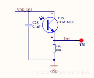 TEMT60000光传感器把光信号转变成为电信号,PA作为模拟输入,接收光传感器的电压,