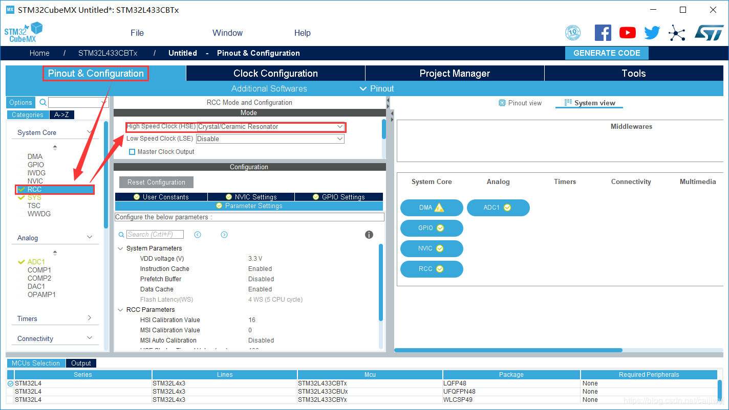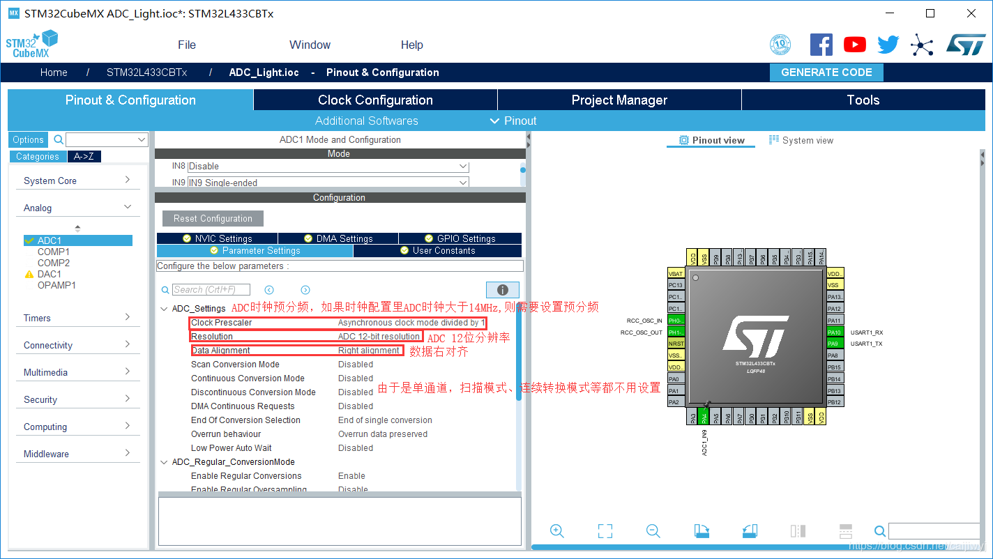 #include #ifdef __GNUC__ #define PUTCHAR_PROTOTYPE int __io_putchar(int ch) #else #define PUTCHAR_PROTOTYPE int fputc(int ch, FILE *f) #endif PUTCHAR_PROTOTYPE { HAL_UART_Transmit(&huart1 , (uint8_t *)&ch, 1, 0xFFFF); return ch; } int fgetc(FILE *f) { uint8_t ch; HAL_UART_Receive(&huart1,(uint8_t *)&ch,1,0xfff); return ch; } 在adc.c中有ADC的初始化void MX_ADC1_Init(void),和在STM32CubeMx配置的一样,ADC的配置也可在这修改 定义变量用于保存ADC采样值 int ADC_value = 0 ; float voltage = 0 ; 在while(1)里 /* USER CODE BEGIN WHILE */ while (1) { HAL_ADC_Start(&hadc1); //开始ADC转换 HAL_ADC_PollForConversion(&hadc1,100); //等待ADC转换完成,第二个参数表示超时时间,单位ms ADC_value = HAL_ADC_GetValue(&hadc1);//获取ADC采样值 voltage = (float)(value *3.3/4096);//ADC采样值到电压的转换 printf("Light voltage:%.3frn",voltage); HAL_Delay(1000); /* USER CODE END WHILE */ /* USER CODE BEGIN 3 */ } /* USER CODE END 3 */ ADC采样值到电压的转换: ADC12位分辨率,也就是说ADC模块读到的数据是12位的数据。。二进制的12位可表示0-4095个数。 电压值 = ADC采样值*(3.3V/4096) 右键我的电脑选择管理,进入计算机管理界面,在设备管理器的端口可以看到串口的端口为COM4 远程连接工具串口连接要选择一样的参数 然后就可以看到串口打印出来的电压值 用手机手电筒照到环境光传感器可以看到电压变化