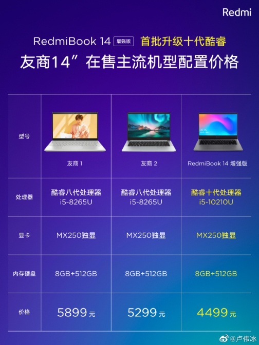 相比整个行业,卢伟冰认为RedmiBook14 增强版不仅做到了首批搭载十代酷睿处理器,更全系升级十代酷睿处理器,i5、i7主流高端配置配齐,无论是价格还是版本上都给消费者更多的选择空间。