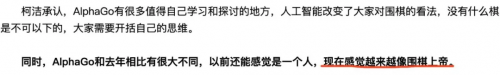 后来柯洁说:“我输的没什么脾气,他现在越来越像上帝了。”