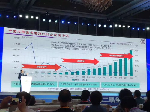 魏少军先从中国集成电路产业数据角度阐述:2018年中国集成电路设计业销售收入为2519.3亿元,比2017年的2073.5亿元增长21.5%,增速比上年的26.1%回落4.6个百分点。在全球集成电路设计业的占比将再次提高。2018年,中国集成电路产业各主要环节继续维持两位数的高速增长,设计业和制造业的增长率超过20%,但封测业增速回落到20%以下。其中,芯片制造业增速最高达到25.6%;设计业位列第二为21.5%。封测业销售额第一次超过2000亿元。