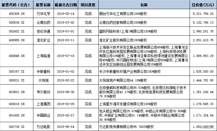 在1759起已经完成的并购事件中,有11起交易总价值超百亿,包括万华化学、云南白药、世纪华通、上海临港、中联重科、韦尔股份、上港集团、中国铝业、万达电影等上市公司。