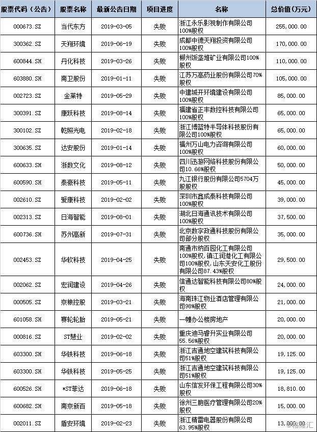 在失败的158起并购事件中,总价值超10亿的共有4起,包括当代东方、天翔环境、南卫股份等。