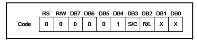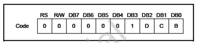 说明:因为是写指令字,所以RS和RW都是0。LCD1602只能用并行方式驱动,不能用串行方式驱动。而并行方式又可以选择8位数据接口或4位数据接口。这里我们选择8位数据接口(D7—D0)。我们的设置是8位数据接口,两行显示,5×8点阵,即0b00111000也就是0x38。(注意:NF是10或11的效果是一样的,都是两行5×8点阵。因为它不能以两行5×10点阵方式进行显示,换句话说,这里用0x38或0x3c是一样的)。