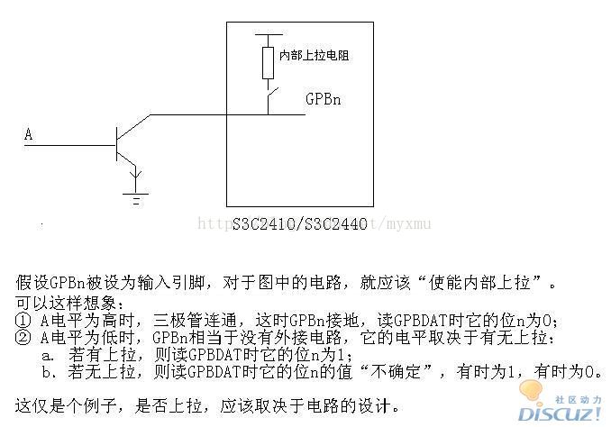 上拉寄存器是控制对应端口上拉使能的。当对应位为0时,设置对应引脚上拉使能,为1时,禁止对应引脚上拉使能。如果上拉寄存器使能,无论引脚功能寄存器如何设置(输入,输出,数据,中断等),对应引脚输出高电平。可见对应于S3C2410的GPB-BPH口内部有上拉电阻寄存器,当相应的上拉电阻使能时,对应的I/O引脚悬空时,表现出高电平。反之,表现出低电平。
