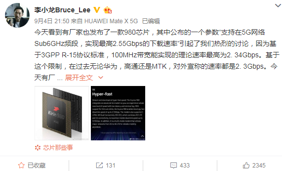 华为高管李小龙质疑Exynos 980下行速率高达2. 55Gbps的微博引发了巨大的争议,在今天,也就是9月6日,李小龙在微博上对该争议进行了回应,他表示: