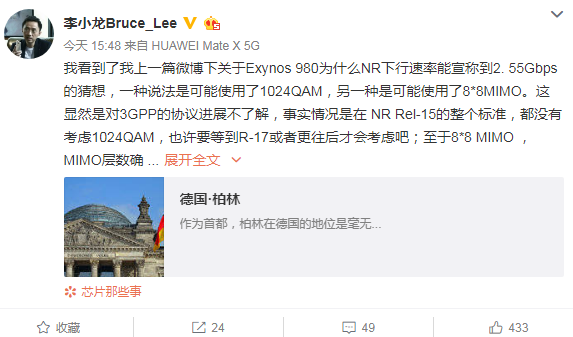 “我看到了我上一篇微博下关于Exynos 980为什么NR下行速率能宣称到2. 55Gbps的猜想,一种说法是可能使用了1024QAM,另一种是可能使用了8*8MIMO。这显然是对3GPP的协议进展不了解,事实情况是在 NR Rel-15的整个标准,都没有考虑1024QAM,也许要等到R-17或者更往后才会考虑吧;