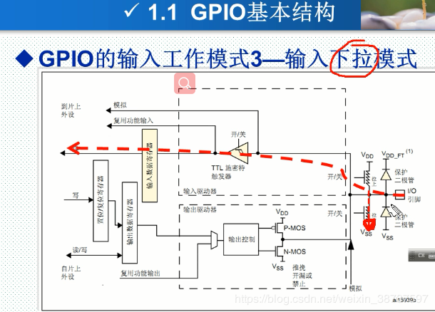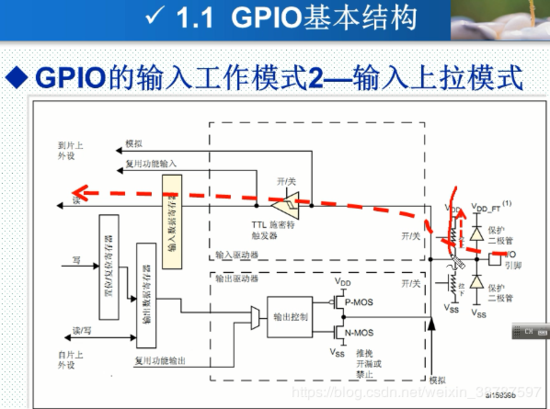 如果被配置为输入上拉后,如上图所示的上拉电阻会被接到Vdd,输入的电平会被拉倒VDD, 之后经过TTL触发器后到输入数据寄存器,之后被CPU读取