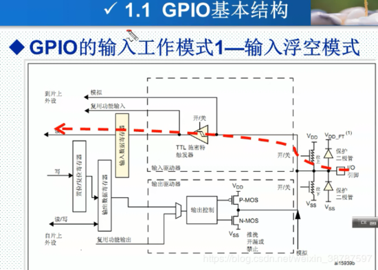 如果一个IO口 被配制成了浮空输入模式,那么它的 输出驱动器这部分的电路是不工作的。电平从IO口输入后先经过可以配置的上拉下拉 ,然后经过 TTL施密特触发器就会被打开,那么就可以通过输入数据寄存器读取IO口的电平。