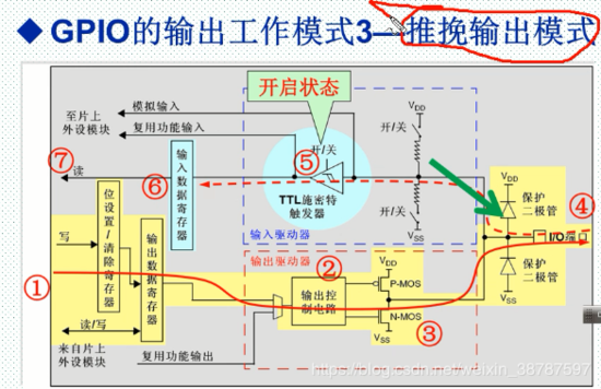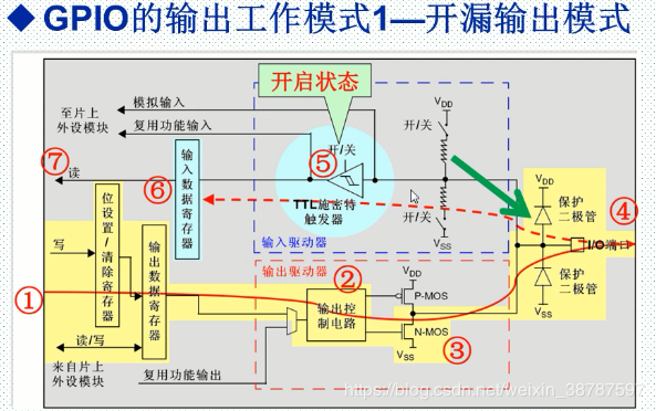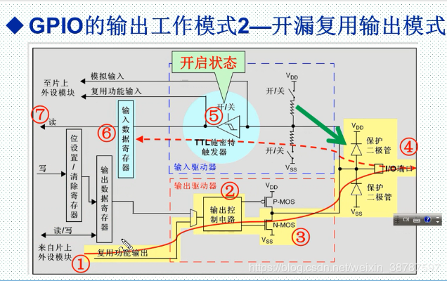 假如通过输出数据寄存器输出一个 1 ,它通过输出控制电路, 那么 N-MOS就会处于关闭状态,那么它的输出电平就不会受