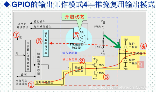 推挽复用输出模式:与推挽输出模式是差不多的,他们唯一的 区别就是 复用功能输出来自 片上外设模块。