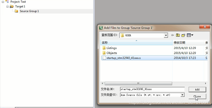 然后要将启动文件添加到工程当中。在工程 中右键选择添加 文件类型选择 .s, 点击 add。