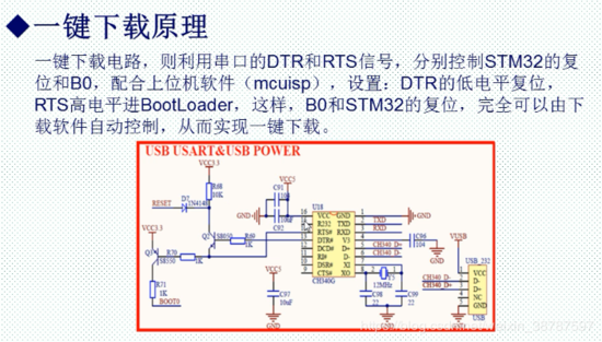 正点原子的一键下载电路 下载时 boot 0 boot1 都接GND,利用这个一键下载电路可以不用手动去切换跳线帽,可以自动下载和执行。