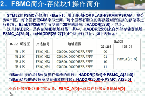 因为HADDR是每个地址对应一个字节,而如果你外部设备是16位宽,那么FSMC的一个地址 就对应两个字节。