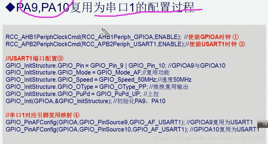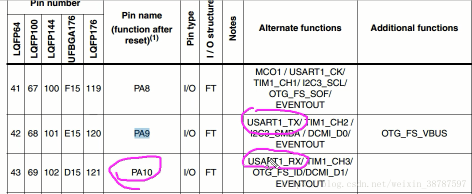 注意:并不是所有的IO都能配置成串口1,这要查datasheet