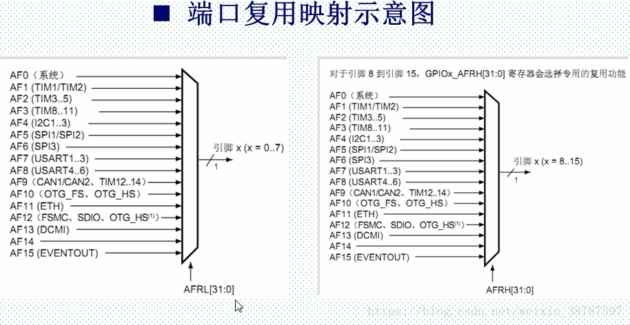 左图就是STM32的复用器,通过这个复用器可以将STM32的引脚复用成对应的功能。例如我们要复用成串口2那么就要将复用器连接到AF7,那么 也就是说引脚的复用功能就是通过AFRL和AFRH来配置的,那么复用器是如何配置的呢?每一组IO对应 两个寄存器 AFRH和AFRL,每一个IO口用到4位。比如我要配置PA2为例,也就是说我们要配置下图中的8到11位。我们要将PA2映射到串口2,那么对应将复用器AFRL2(AFRL8-9)配置为0111,那么PA2就连接到了串口2。 还有:举例:要复用PA3,那么AFRL配置PA3的0-7 AFRH配置PA3的8-15