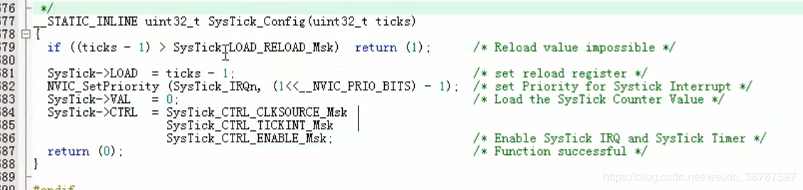 还有一个函数在core_cm4.h/core_cm3.h里面的SysTick_Config(uint32_ticks)这个代码的作用;初始化SysTick相关的寄存器,并且开启SysTick相关的寄存器,入口参数ticks.,也就是说ticks个时钟周期产生一次中断。