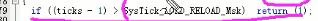 代码的第一行对这个ticks的值进行一个有效性判断,因为这个ticks的值不能是无限大,因为ticks最终是要写到LOAD寄存器的,从LOAD寄存器被加载到这个VAL寄存器,ticks的值 不能大于