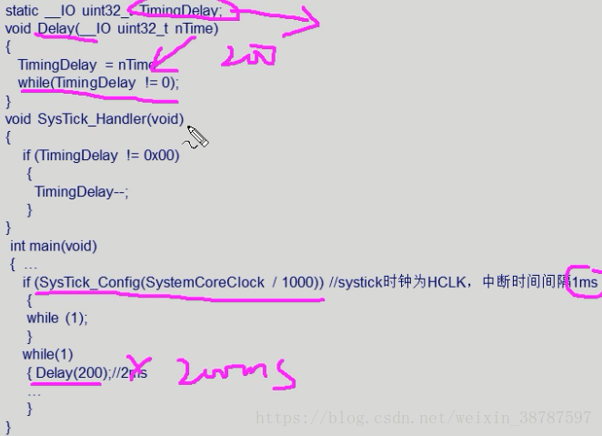函数功能:每1ms产生一次中断,进一次中断TimingDelay就-1,直到TimingDelay为0就延时了200ms。