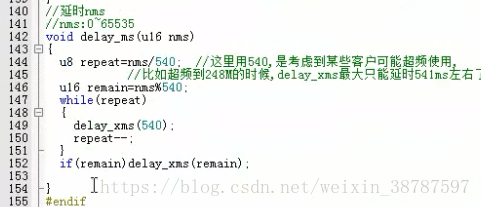这里将入口参数除以540是为什么呢?,目的是增加延时时间的范围,比如说我们要延时一个任意长度的延时时间,那么我们这里实际上就把他切成了540毫秒一份,比如说你要延时1000ms,他就先延时540ms再延时460ms这样就延时了1000ms。