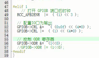 以下的代码中就是通过GPIOB的结构体类型指针去访问他的成员变量,利用->这个 符号就可以指向他的各个成员。