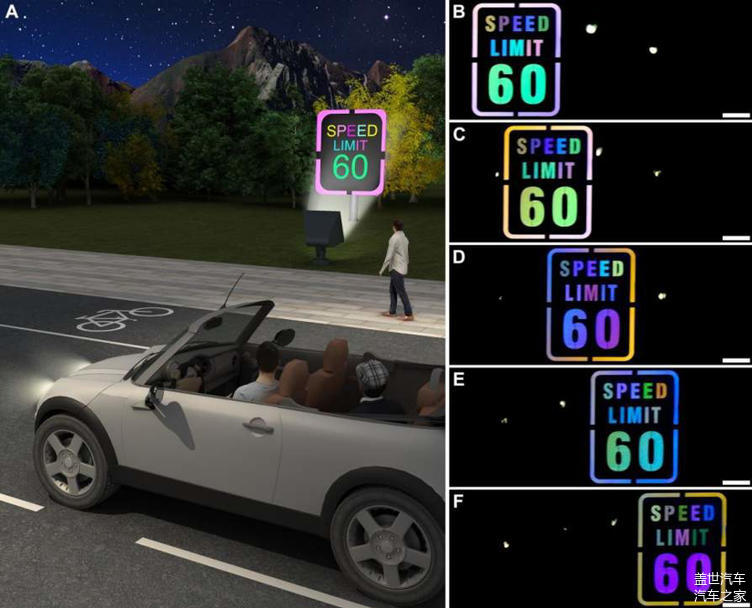 在一组实验中,研究人员利用该新薄膜打造了一个写有字母和数字的限速路标。随后,科学家们在附近放置了一盏白灯,以照亮该标志。当有一辆快速行驶的汽车经过时,司机的视角会发生变化,路标上文字的颜色似乎在闪烁。